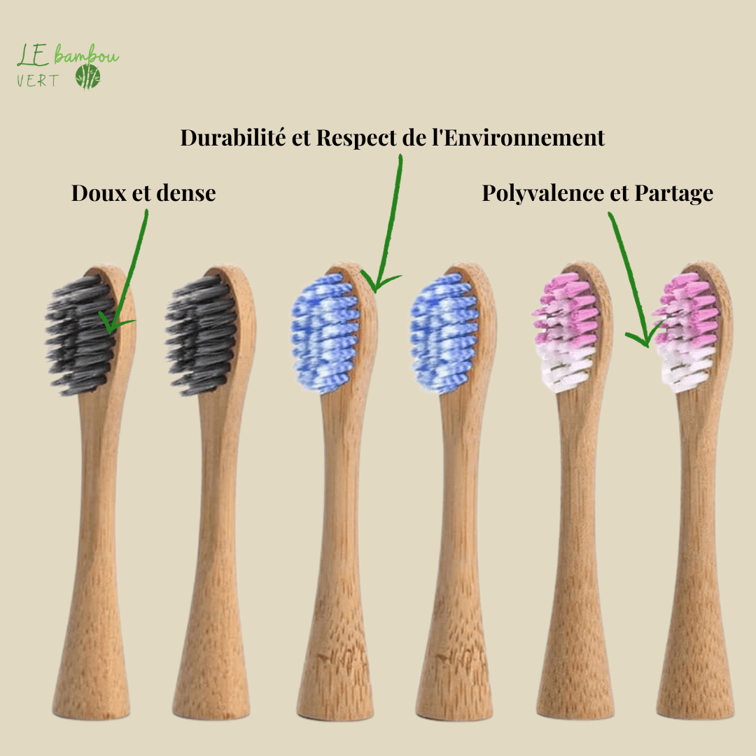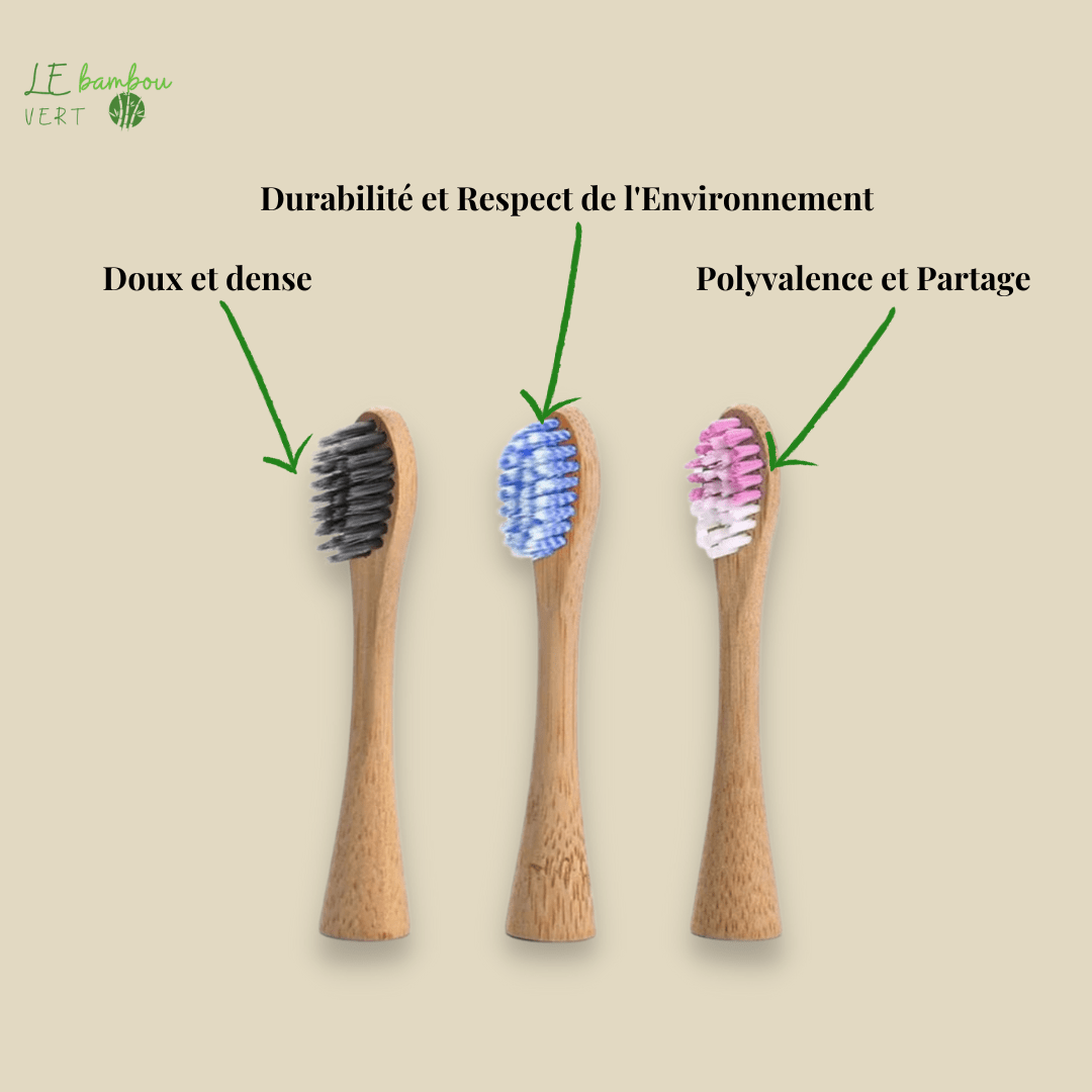 : Nos trois têtes de brosse sont fabriquées à partir de bambou naturel, une alternative écologique aux têtes en plastique.